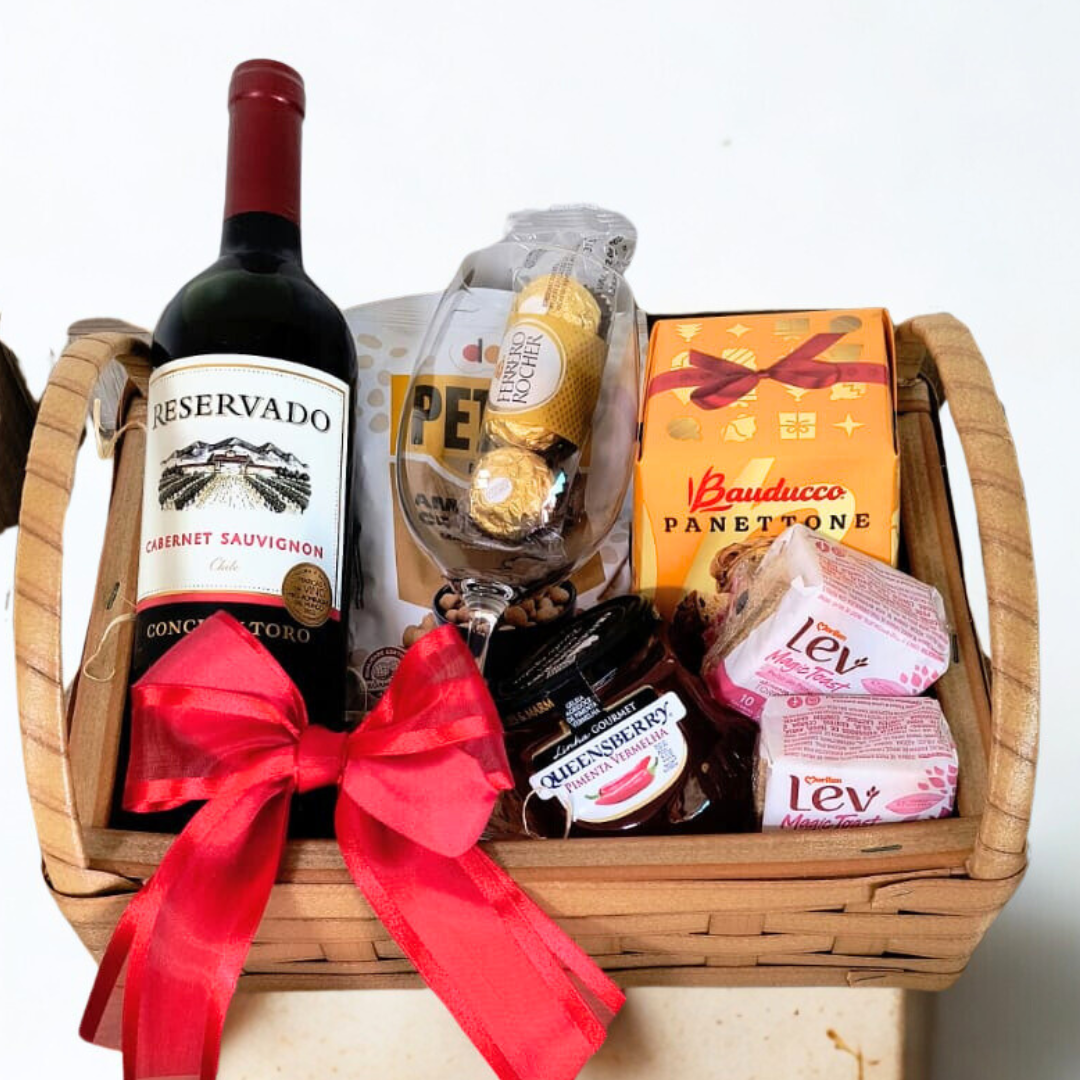A Cesta de Natal Sofisticada é uma cesta com Vinho, Panettone e petiscos para você supreender aquela pessoa especial em sua vida!